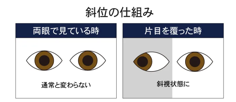 斜位は両目で注視している時は斜視が見られないが、片目を隠すと隠した側の目に斜視が出現する状態を言います。